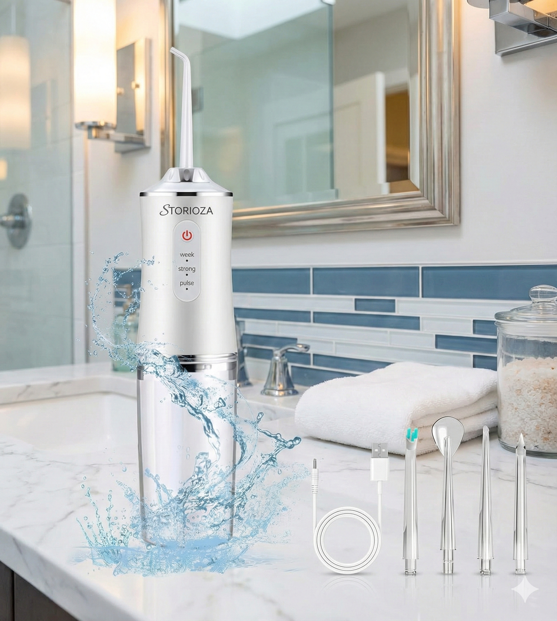 Product Overview The Storioza Cordless Water Dental Flosser provides an efficient and convenient solution for superior oral hygiene. Designed for both home and travel use, this oral irrigator uses pulsed water flow to remove debris between teeth and below the gumline where traditional brushing and flossing cannot reach.
