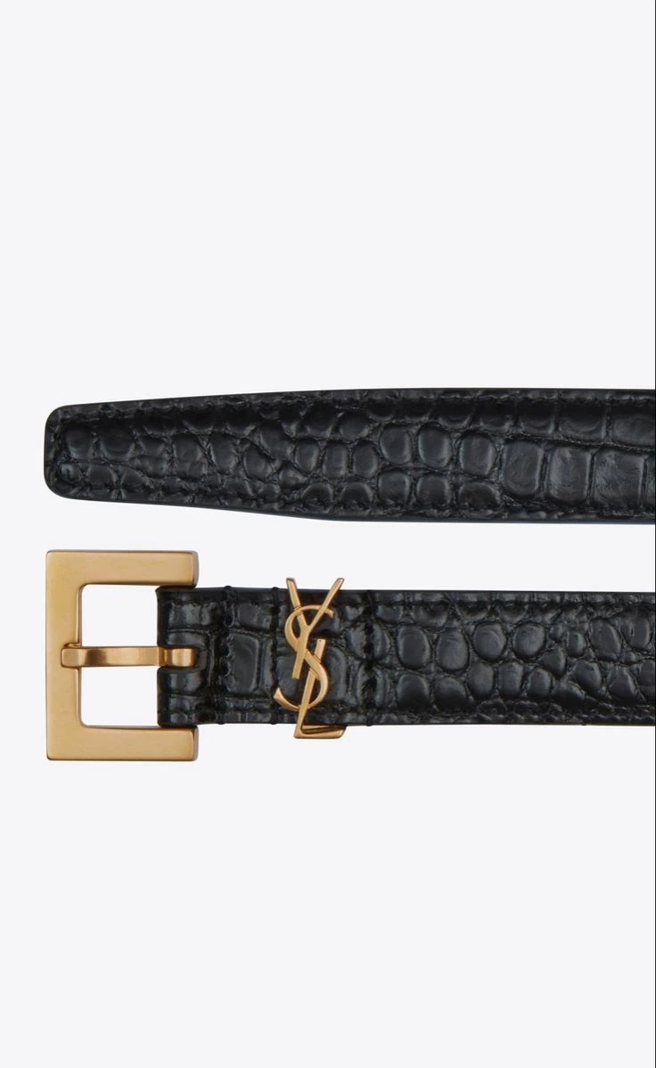 Crafted from high-gloss black leather with a meticulous crocodile-embossed finish, this piece features the world-renowned interlocking YSL monogram as a gold-toned belt loop keeper—a subtle yet undeniable “flex” for the discerning wearer.